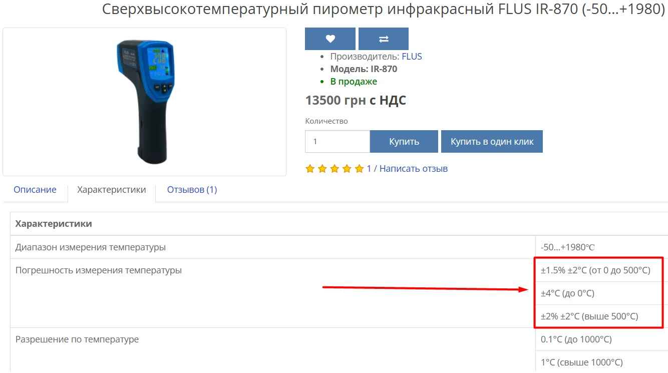 - Зависимость ошибки пирометра от температуры. Это особено заметно по высокотемпературным (широкодиапазонным инфракрасным термометрам), как например для IR-870 FLUS (одного из ТОПовых промышленных), представленным у нас на сайте. Например при -10 ℃ ошибка составит ±4℃, для 100 градусов ±2℃, для 1000 ±2℃. Это особенная разновидность нелинейности - не непрерывная, а ступенчатая. При переходе через поддиапазон ошибка меняется скачком (в сторону уменьшения или увеличения). Например в диапазонах от "до 0 ℃" до "от 0 до 500℃" ошибка уменьшается в 2 раза с ±4℃ до ±2℃.