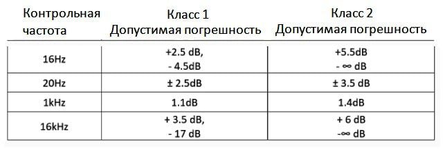Таблица 1: Разбивка пределов допуска для Класса 1 и Класса 2 по четырем контрольным частотам (из IEC61672-1: 2013)