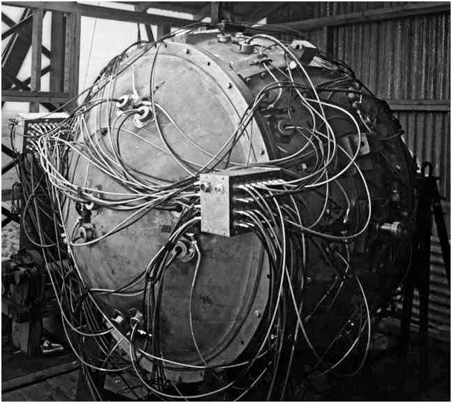 Бомба з тротиловим еквівалентом 20 КТн і кодовим найменуванням "Трініті" була підірвана рано-вранці 16 липня 1945 року в пустелі Аламогордо, штат Нью-Мексико. "Трініті" був побудований за дуже складною схемою (на її розробку пішли роки роботи кращих вчених у своїй галузі – хіміків, фізиків, підривників, математиків!), але й набагато більш ефективною, ніж "Малюк", скинутий через 3 тижні на Хіросіму Ця “павутина” із дротів подає сигнали до 32-х підривників, які повинні одночасно (!) стиснути сферу з плутонію, щоб запустити ядерну реакцію. Це так звана імплозивна (стискаюча) схема. Бомбу такого типу було скинуто на друге японське місто Нагасакі.