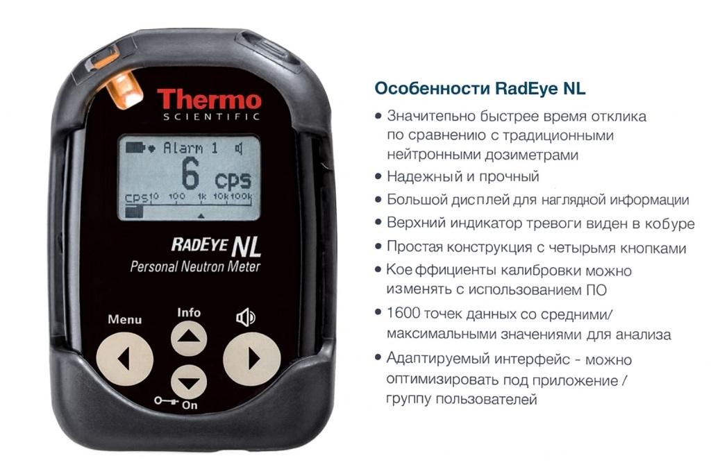 У той час як традиційні сферичні або циліндричні лічильники радіації зазвичай важкі та громіздкі, детектор RadEye NL компактний та легкий. Користувачі (наприклад, обслуговуючий персонал атомних станцій або митний пункт) можуть використовувати RadEye NL, який оснащений лічильною трубкою на гелії-3 з тиском наповнення 2,5 бар. Radeye NL — це невеликий легкий пейджер, який зручно носити в руці, в кобурі або використовувати з подовжувачем телескопічним для вимірювання інтенсивності нейтронів низьких енергій.