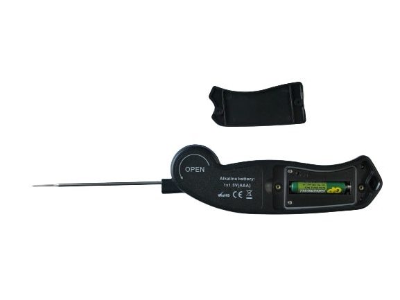 І це друга радикальна відмінність. Теж крок уперед. Тепер термометр став складним. Як ножик. По ходу скажемо, і по темі, що ніж звичайно це інструмент, який є потенційно небезпечним через наявність гострого леза, а в нашому термометрі є тонкий і теж досить гострий штир. Він і повинен бути таким, щоб проникнути не тільки в теплу або гарячу серцевину, але і пронизати тверду запечену, апетитну скоринку.