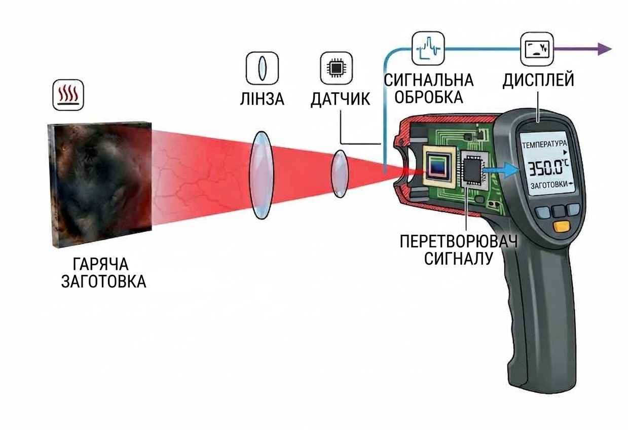 Чому? Якщо подивитися спереду на пірометр, побачимо лінзу. Її завдання – фокусувати вхідне випромінювання на датчику. Датчик розташований далі, усередині і ми його не бачимо. І датчик нагрівається пропорційно до вхідної температури.