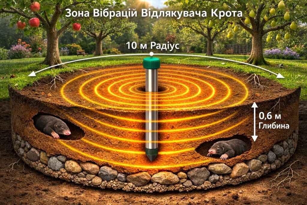 Якщо брати садовий ґрунт в Україні, це суглинок/чорнозем. Відповідно, зона вібраційної дії за висотою становить 0,5-0,8 метра. Це з урахуванням часткового проникнення вібрацій під відлякувач - щось все-таки та й пробивається.